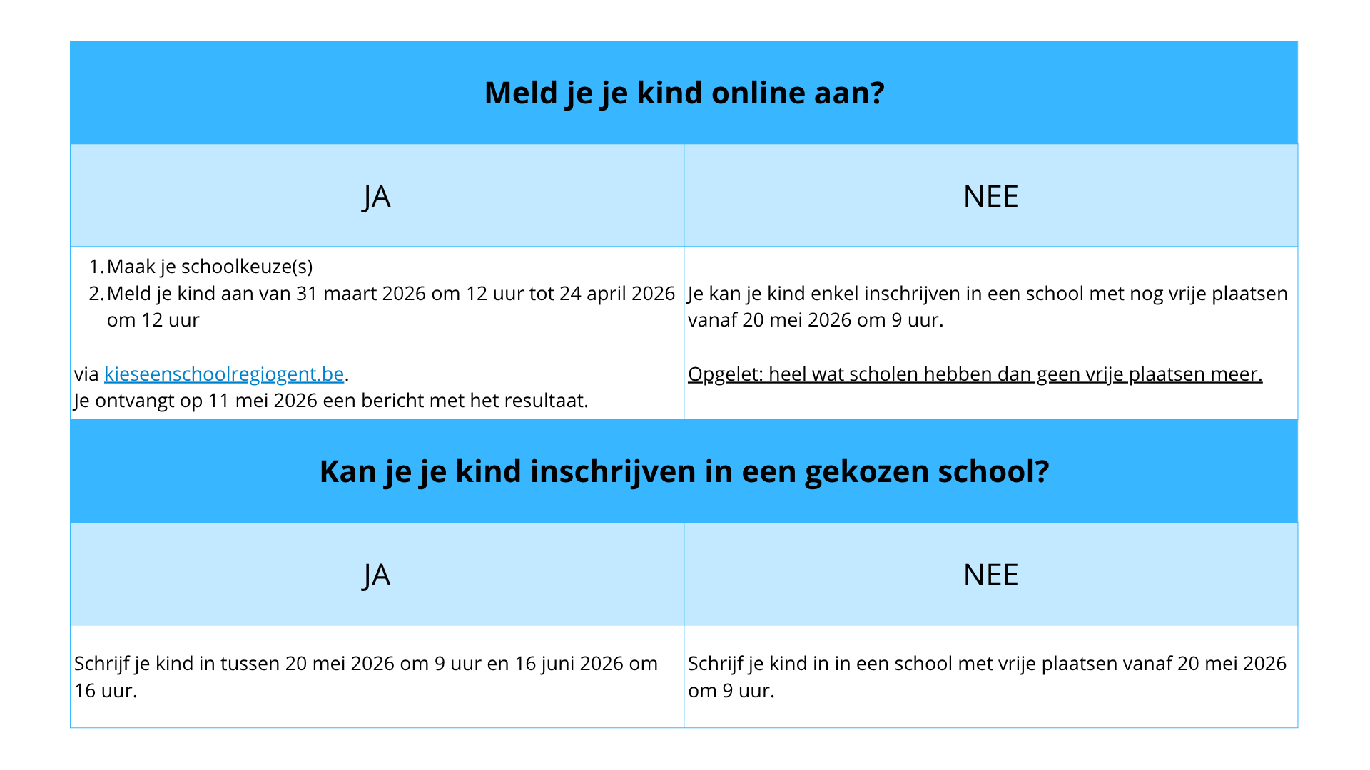 - Schrijf je kind in een school in met vrije plaatsen. Dit kan vanaf 20 mei 2026 om 9 uur. Je vindt vanaf 19 mei de vrije plaatsen op kieseenschoolregiogent.be.